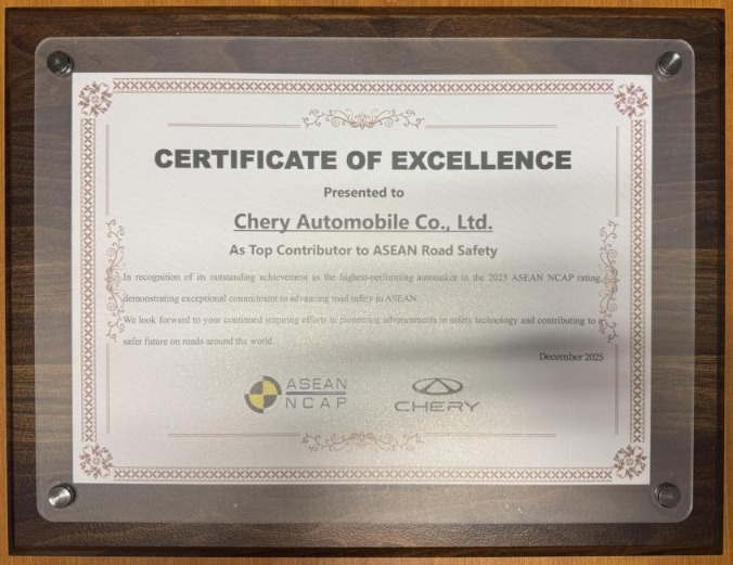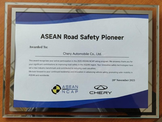 图为ASEAN NCAP官方授予奇瑞汽车“东盟说念路安全最好孝敬奖”