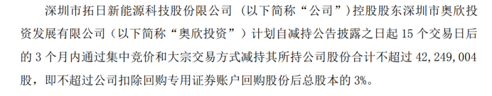 奥欣投资现在抓有拓日新能397,590,714股,占公司扣除回购股份后总股本的28.23%,是公司的控股鞭策。这次减抓的主要原因是为了补充本人资金储备,以营救上市公司的发展资金需求。