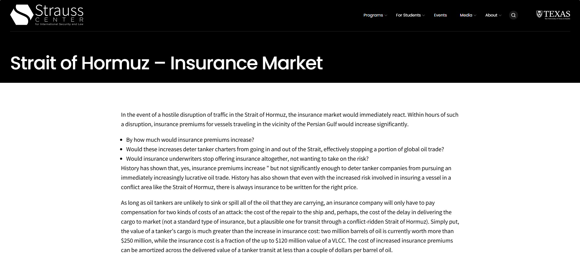 莫得事理折服霍尔木兹海峡的冲突会导致保障费率过高,从而在永劫候内显赫减少交通流量。尽管在油轮战时间油轮的保障成本照实加多了,但它从未加多到承保东谈主对最大构兵风险敞口所收取的价钱,会更始为租家购买的保障数目为零的程度。换句话说,从微不雅经济学的角度来看,总有东谈主现象接受和承保风险……独一价钱合乎。