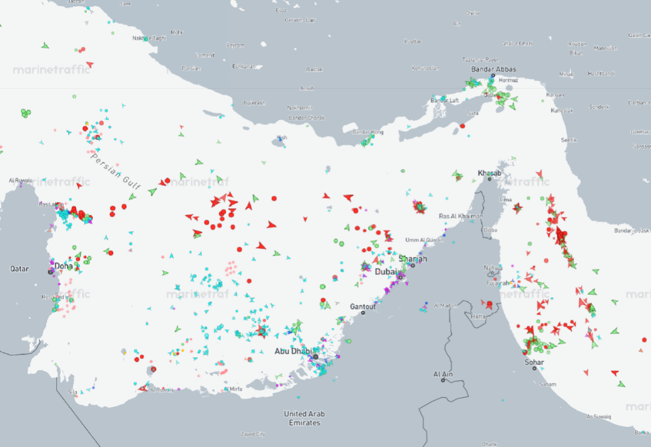 笔者撰文时,霍尔木兹海峡的情况:多量油轮被困波斯湾和海峡进口处,同期由于定位烦嚣,不少船只如故“漂”到了内陆,平素航路已断 图源:AIS